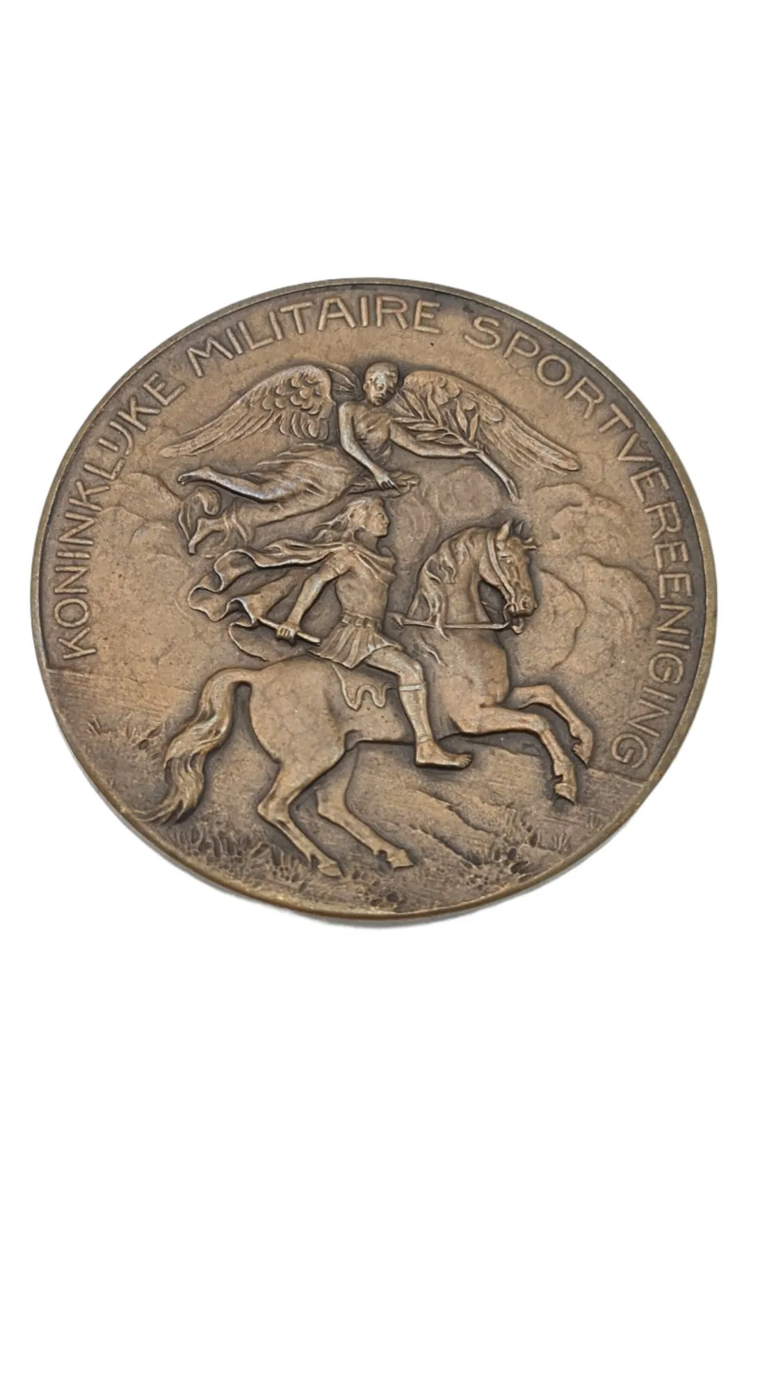 Penning koninklijke militaire sportvereniging gemaakt door de bekende medaille maker Begeer in Utrecht. Uitgegeven voor de vierdaagsche afstandsrit 1925. Dit zal naar alle waarschijnlijkheid door een cavalerist gedaan zijn. Prachtige grote penning van ca 5 cm groot uitgevoerd in brons.